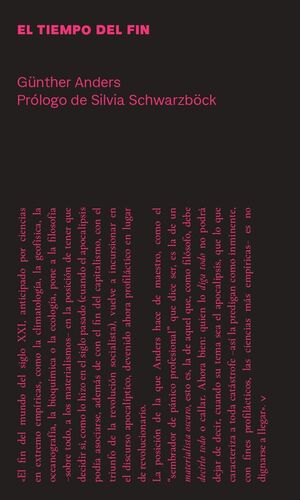 «El fin del mundo del siglo XXI, anticipado por ciencias en extremo empíricas, como la climatología, la geofísica, la oceanografía, la bioquímica o la ecología, pone a la filosofía –sobre todo, a los materialismos– en la posición de tener que decidir si, como lo hizo en el siglo pasado (cuando el apocalipsis podía asociarse, además de con el fin del capitalismo, con el triunfo de la revolución socialista), vuelve a incursionar en el discurso apocalíptico, devenido ahora profiláctico en lugar de revolucionario. La posición de la que Anders hace de maestro, como el “sembrador de pánico profesional” que dice ser, es la de un materialista oscuro, esto es, la de aquel que, como filósofo, debe decirlo todo o callar. Ahora bien: quien lo diga todo no podrá dejar de decir, cuando su tema sea el apocalipsis, que lo que caracteriza a toda catástrofe –así la predigan como inminente, con fines profilácticos, las ciencias más empíricas– es no dignarse a llegar».